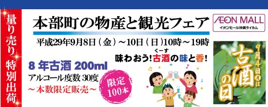 本部町の物産と観光フェアinイオンライカム!今回も「試飲が出来る」ので、観光でお越しのお客様も多いイオンライカム店。泡盛を市裸体方も、古酒を知らない方も大好きな方も、9月4日の古酒の日にちなんで、古酒の味と香りを味わっていただきたいです!